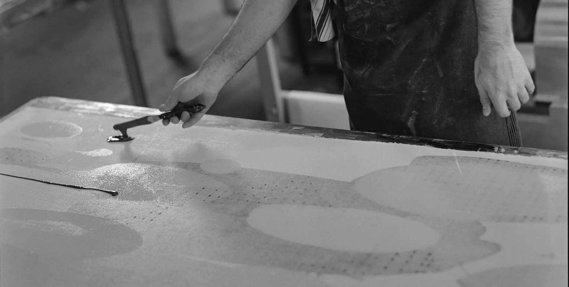 Gone are the tightly edged signs and shapes of before. We are confronted instead with diffused blankets of colour and bleeding spots of blue, grey and pale pastels, hanging in deeply textured space like fleeting shadows or flashes of lights. The random patterns play out the literal meaning of the word – Aspar is old Scottish for ‘spread’. Band relinquishes control and allows his inks to speak for him. Inflating scale, he squeezes more from his vision, enjoying the process of experimentation. The plywood printing surface achieves an unusually grainy texture underlying the graphic surface of each image – a fine linear veil that disrupts the smoothness of the dominant oblong shapes.